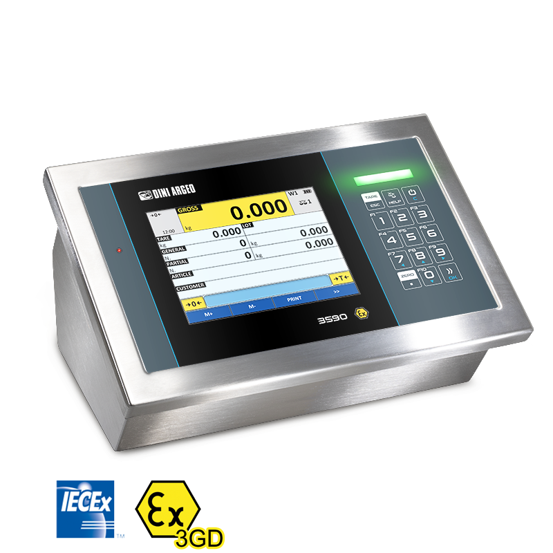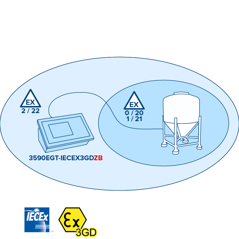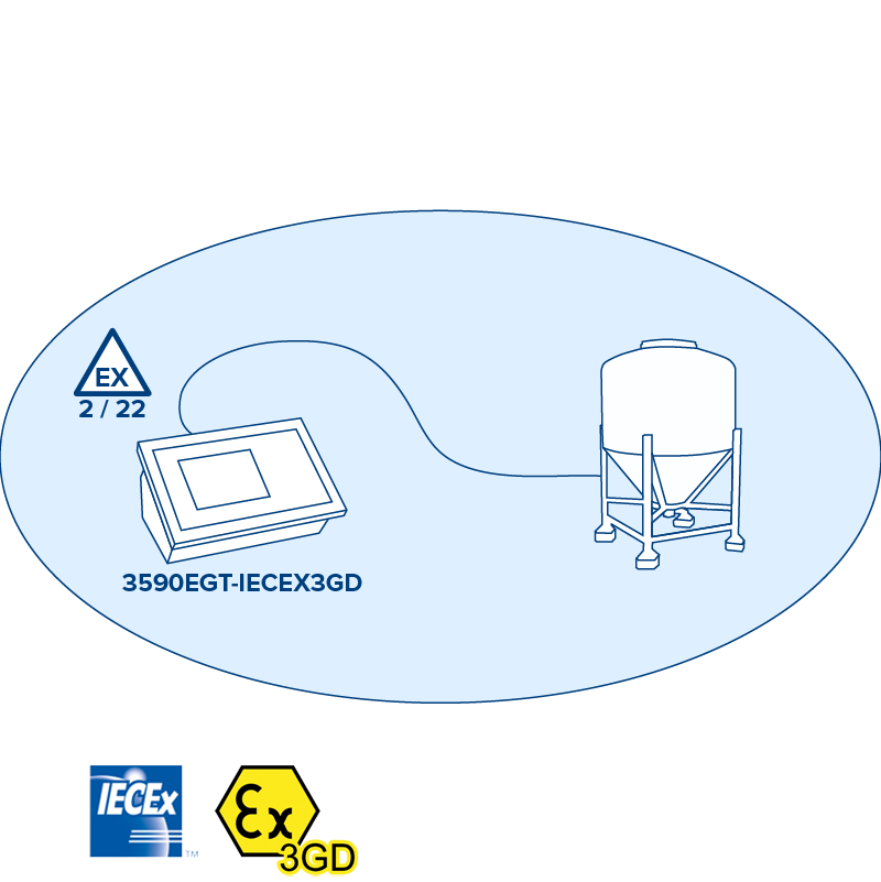 3590EGT-IECEX3GDZB | Ex colour Touch Screen indicator for zone 2/22 with AF01 software, connectable directly to load cells installed in zone 1/21 and 0/20. IP68 stainless steel enclosure. ATEX/IECEX marking: II 3(1)G Ex nR [ia] IIC T6 Gc X (0°C<= Ta <=50°C) for gas and II 3(1)D Ex tc [ia] IIIC T85°C Dc IP65 X (0°C<= Ta <=50°C) for dust. Provided with safety instructions and the ATEX EU declaration of conformity (EN, DE, FR, ES and IT). |