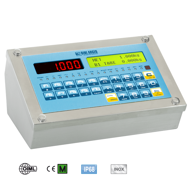 High performance digital weight indicator, with 3 serial ports, transmission protocols for data communication, completely configurable printouts, integrated alibi memory and port for connection to barcode/badge reader. The wide range of connectable accessories and printers guarantees the maximum interfaceability and versatility. CE-M approvable (OIML R-76 / EN 45501).