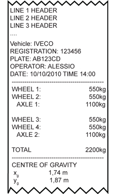 - Programmable printout from keyboard or from PC (through the free Dinitools.net software) of 30 print formats linkable to various functions; each print format may contain up to 2048 positions which may be ASCII codes or preconfigured print blocks (i.e. Company name, weight of each pad or axle, total weight, centre of gravity coordinates, etc.).