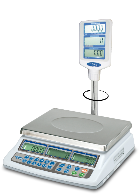 - 3 backlit LCD displays on keypad on operator side and 3 backlit LCD displays on revolving column on customer side, with digits 20mm high, for simultaneous indication of weight, price and amount.