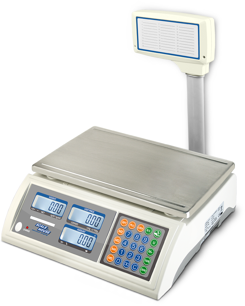 Dual range price computing scales with column, for commercial use. Connectable to the printer, for amount totalization function. 10 PLU memory.