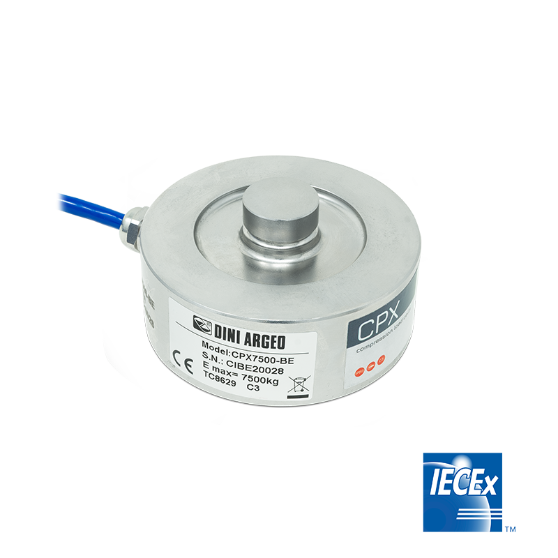 CPX7500-BE | Compression approved load cell, C3, Max=7500kg. IECEx protection Ex ia IIC T5 Ga, Ex ib IIIC T130°C Db, Ex ec IIC T6 Gc, Ex tc IIIC T80°C Dc for Ta: -20°C~+55°C or Ex ia IIC T6 Ga, Ex ib IIIC T85°C Db, Ex ec IIC T6 Gc, Ex tc IIIC T60°C Dc for Ta: -20°C~+40°C. |