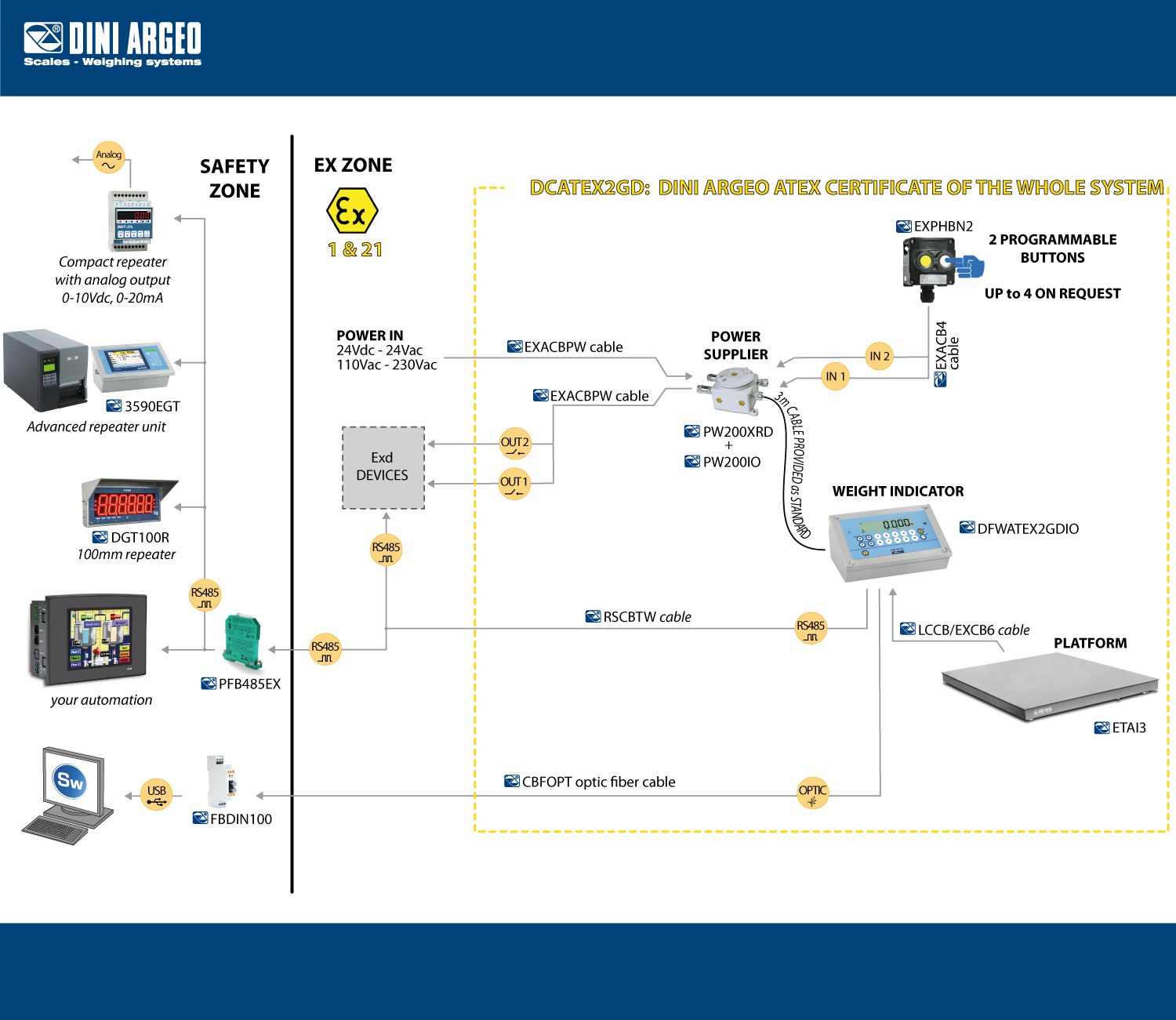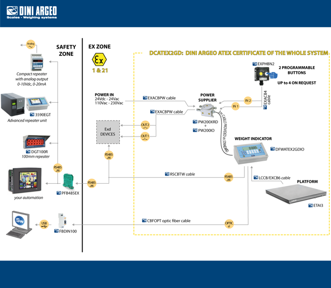 Declaration of ATEX conformity of the assembly. Ex II 2G IIC T4 Gb X and Ex II 2D IIIC T197°C Db X SYSTEM, with relative label of whole system, for Dini Argeo ATEX weight indicator connected a mechanical structure with ATEX load cells (each cell must be certified with CCATEX option). Provided with descriptive document of the assembly and ATEX EU declaration of conformity of the assembly (EN and IT). Includes IP68 connection between platform and weight indicator.