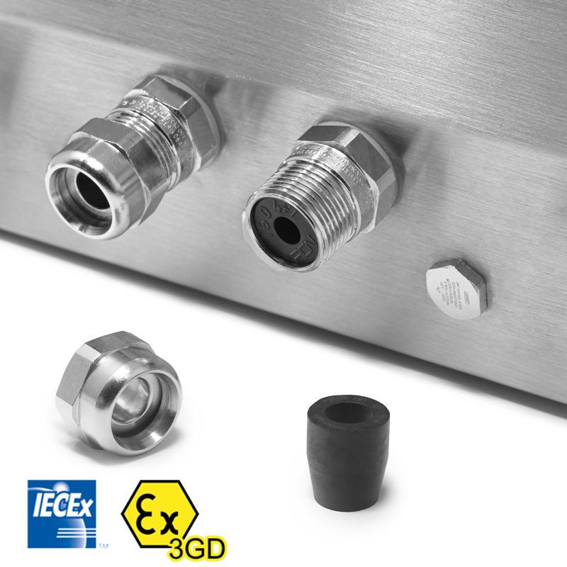 PG7 and PG9 cable glands with adapters for 4 to 7 mm and 7 to 10 mm cable routing. Equipped with anti-friction system that does not require additional external cable fixing, as required by the IECEx scheme and ATEX directives.