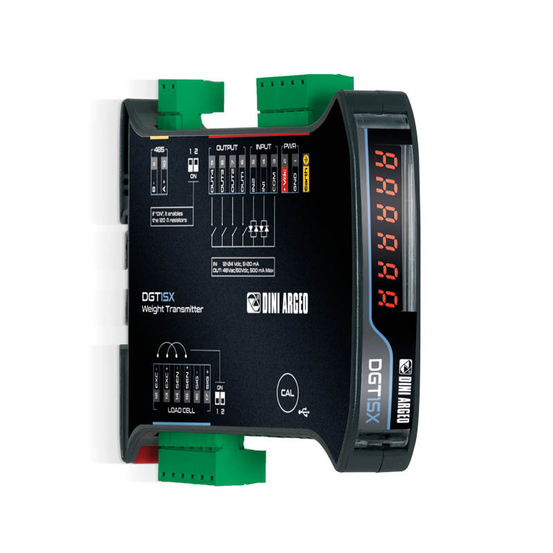 DGT1SX-AN | Weight transmitter on DIN rail, with 2 INPUT, 4 OUTPUT and analog output. Fitted with 5-key keypad and LED display. Multifunction weighing program. |