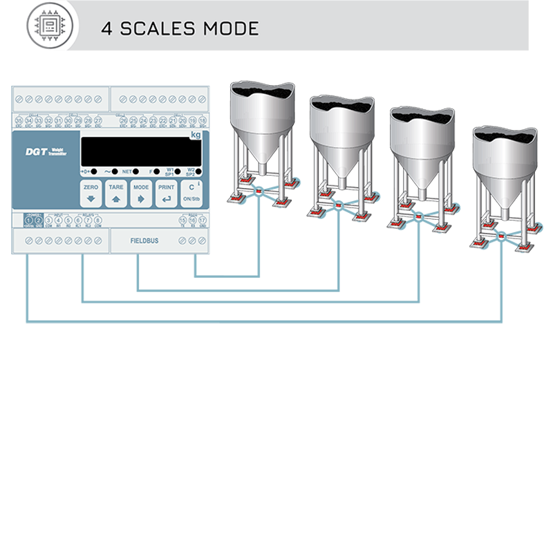 4-channel weight transmitter for weight transfer to PLC via fieldbus, analog output or RS485.It allows the reading and diagnostics of each load cell or each connected scale (up to 4).