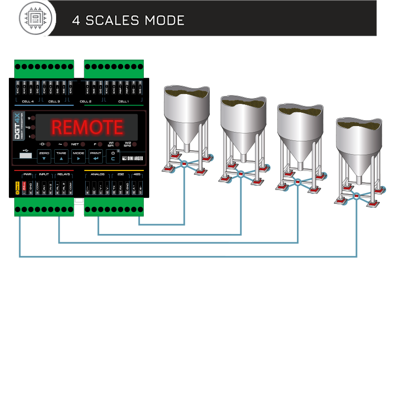 DGT4XMODTCP | High speed 4 channel Din rail weight transmitter, with 2 IN, 2 OUT and MODBUS TCP/IP port. 5-key keypad, LED display. |