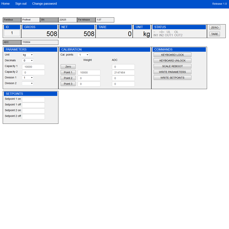 The integrated WEB SERVER allows complete diagnostics, calibration and remote configuration of the weight transmitter from the Ethernet network. Only available for PROFINET, ETHERNET/IP and MODBUS TCP/IP models.
