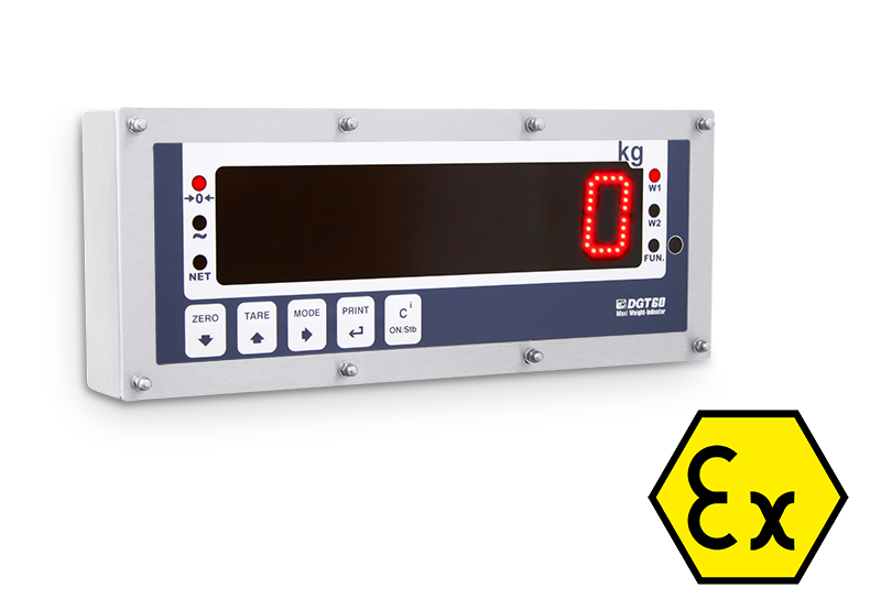 ATEX 3GD weight repeater with 60mm LED display. IP68 stainless steel case and 5-key keypad. Protection mode: ATEX II 3G Ex nR IIC T6 Gc X for gases and ATEX II 3D Ex tc IIIC T85°C Dc IP68 X for dust. Provided with safety instructions and the ATEX EU declaration of conformity (EN, DE, FR, ES and IT).