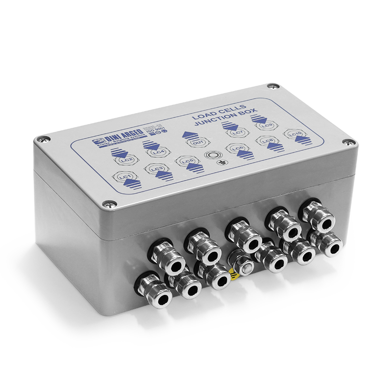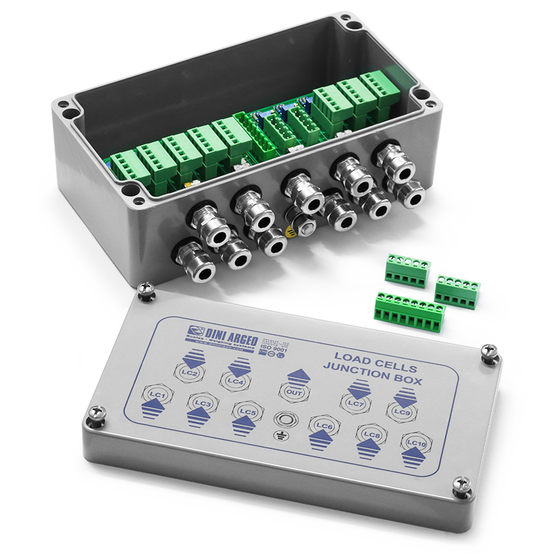JB10QD-1 | RS485 equalisation box for connection with up to 10 digital load cells. Reinforced polyester box, with 10 + 1 cable glands and surge arresters. |