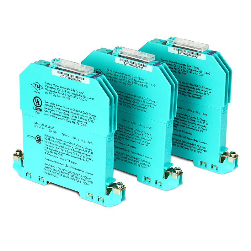 Kit of three intrinsic protection Zener barriers, for connection of devices in ATEX area with devices in safe area, housed in an ABS box.