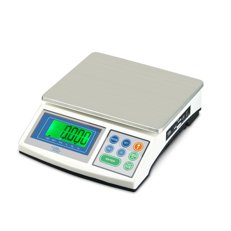 NWSH30K | Multifunction/counting scale with 30 kg capacity, 1 g division, stainless steel plate 218x267 mm, backlit LCD display and mechanical waterproof keypad. |