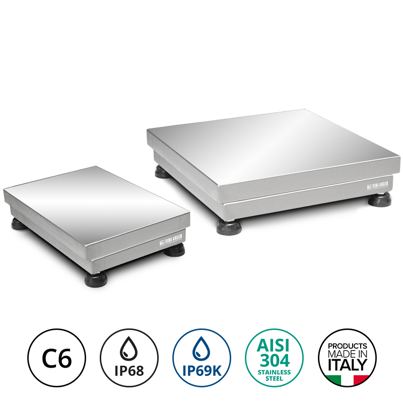 The AISI 304 stainless steel construction and IP68 and IP69K load cell protection make these platforms ideal for industrial and commercial applications in harsh environments with high humidity and water exposure.