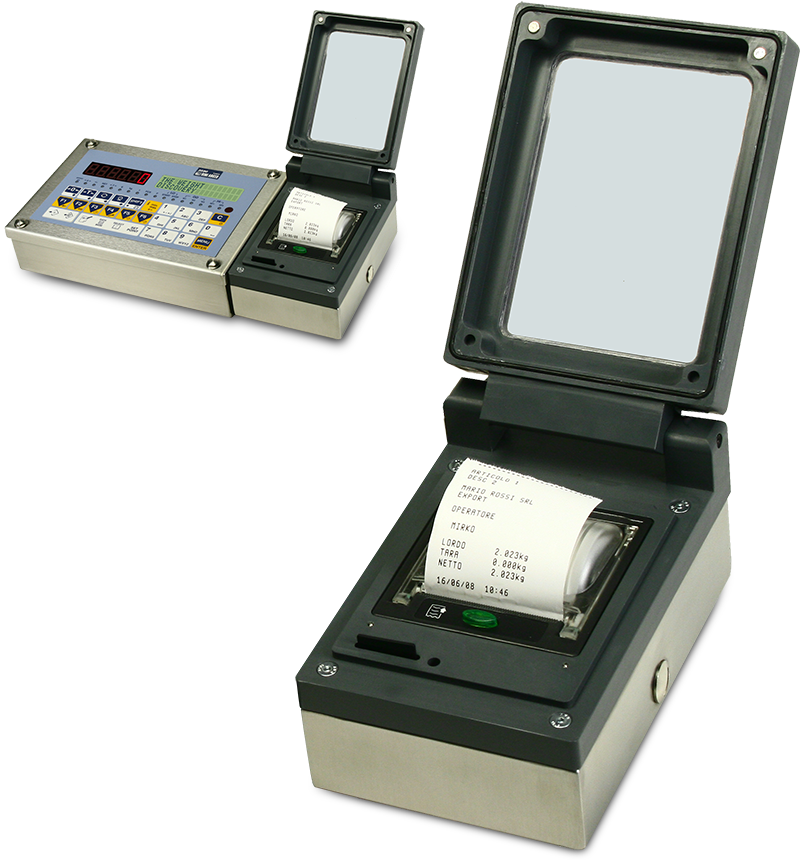 Thermal printer with IP65 stainless steel case and protection shutter door against water sprays and dust. Particularly suitable for the chemical and foodstuff industry, as well as in applications in harsh or strict hygiene environments. Mounted attached to the "XT" weight indicators, with a STAINLESS STEEL case.