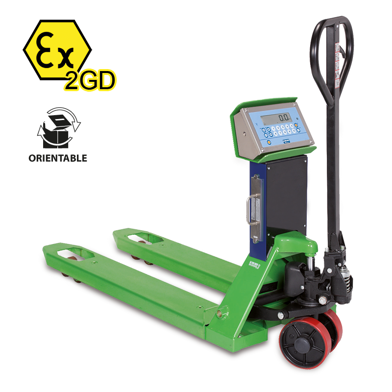 - Pallet truck scale made with ATEX certified components, suitable for use in hazardous areas (zones 1 and 21 & 2 and 22).