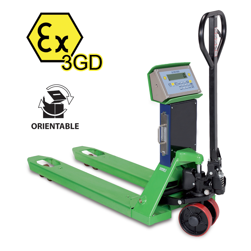 - Pallet truck scale made with ATEX certified components, suitable for use in hazardous areas (zone 2 and 22).